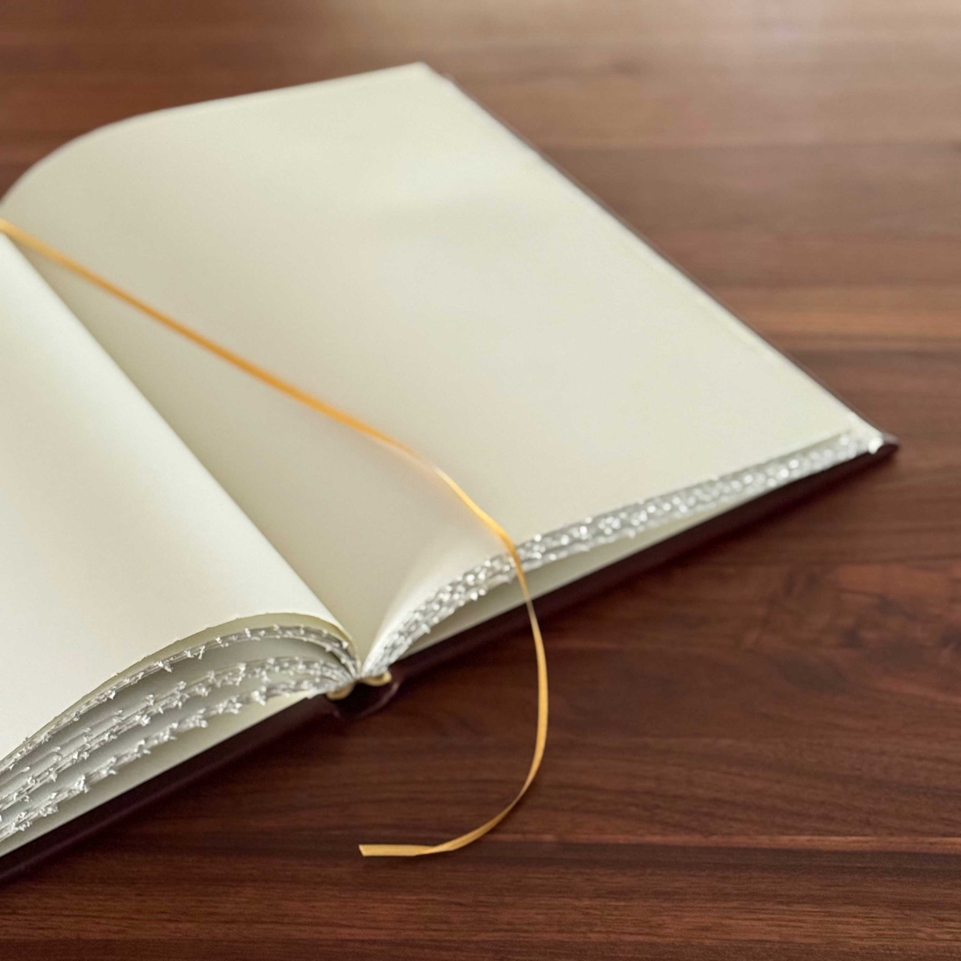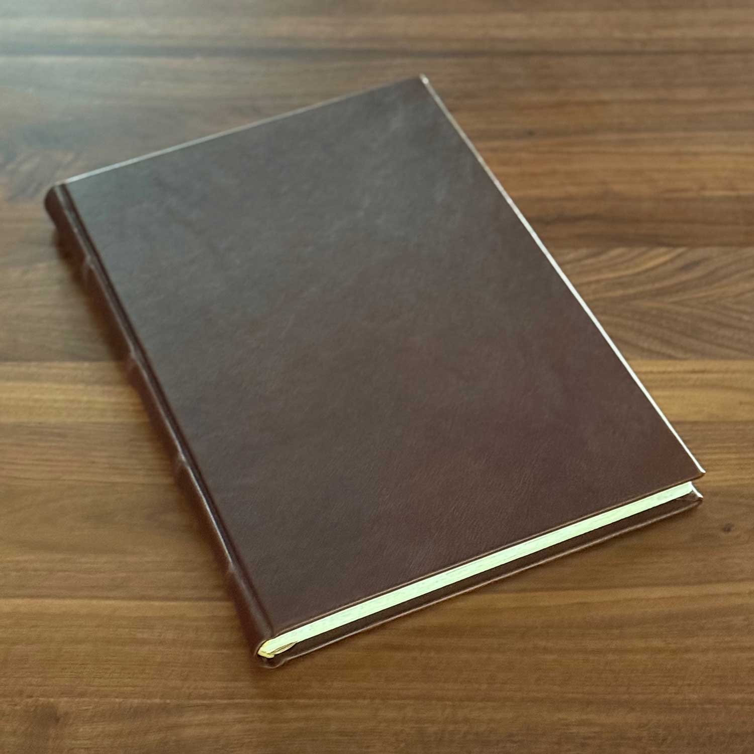 This large journal is handcrafted in Italy in the style of an old book. It's the perfect place to record big ideas, drawing, logs, and more in a journal to be kept for generations. Hand cut pages. Approximately 10 x 14 inches. Real leather, brown with a natural wax finish 120 natural ivory sheets, unlined. Pages are thick and sturdy. Unbranded so you can make it your own.