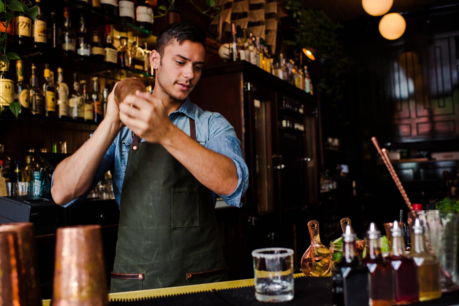 Hardmill waxed canvas Industry Aprons are built to handle heavy use while having a classic and refined look. Perfect for working at the market, or use behind the bar or front of house at a restaurant, these aprons will wear in beautifully over time. Crafted from 10.10 oz. army duck waxed canvas and equipped with 4 oz. full grain oil-tanned leather straps secured by copper rivets, this apron is designed to withstand tough conditions. It is water-resistant and easy to clean with a damp cloth. Practical features include a pen pocket, two waist pockets, and adjustable 36-inch leather waist straps. Measuring 29 inches wide by 34 inches tall, it offers both durability and comfort for your work needs.