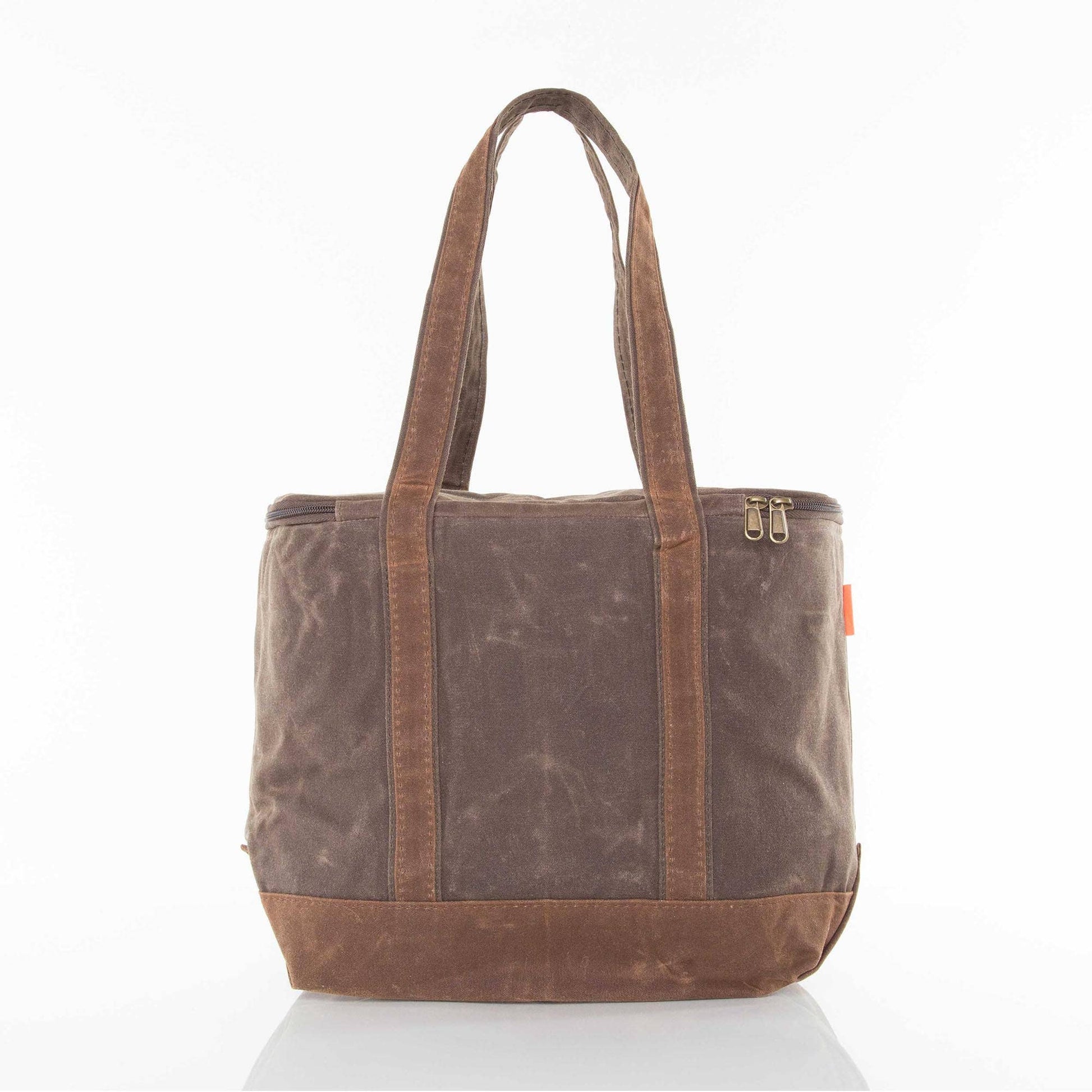 Spacious waxed canvas lunch cooler with USDA-approved insulation to keep food at your desired temperature. Features a top zip closure, front pocket, and mesh storage compartment. Water-resistant construction with comfortable contrast-trim handles. Dimensions: 12"H x 19"W x 6"D. Great cooler bag for day trips, picnics, shopping and more.