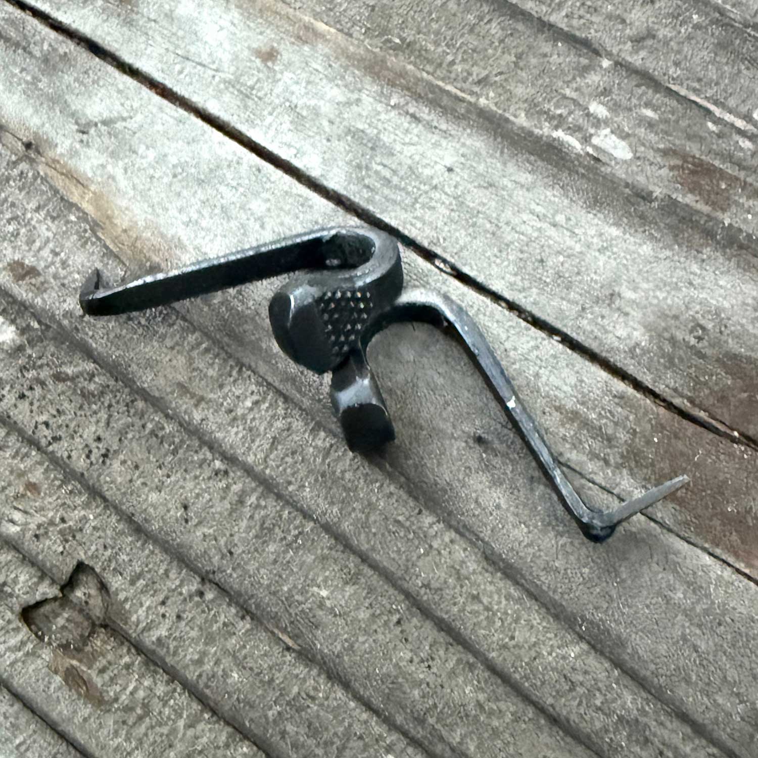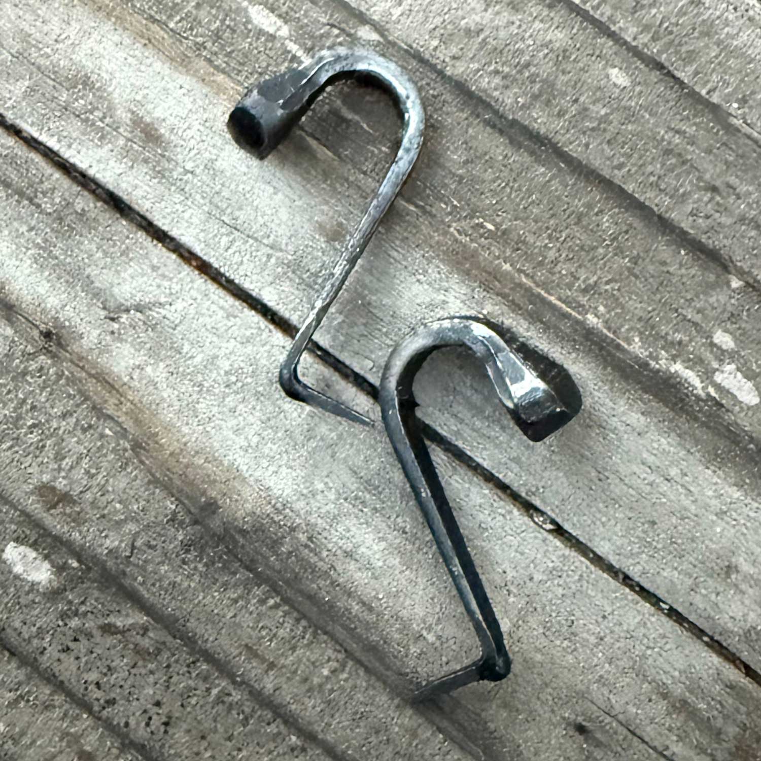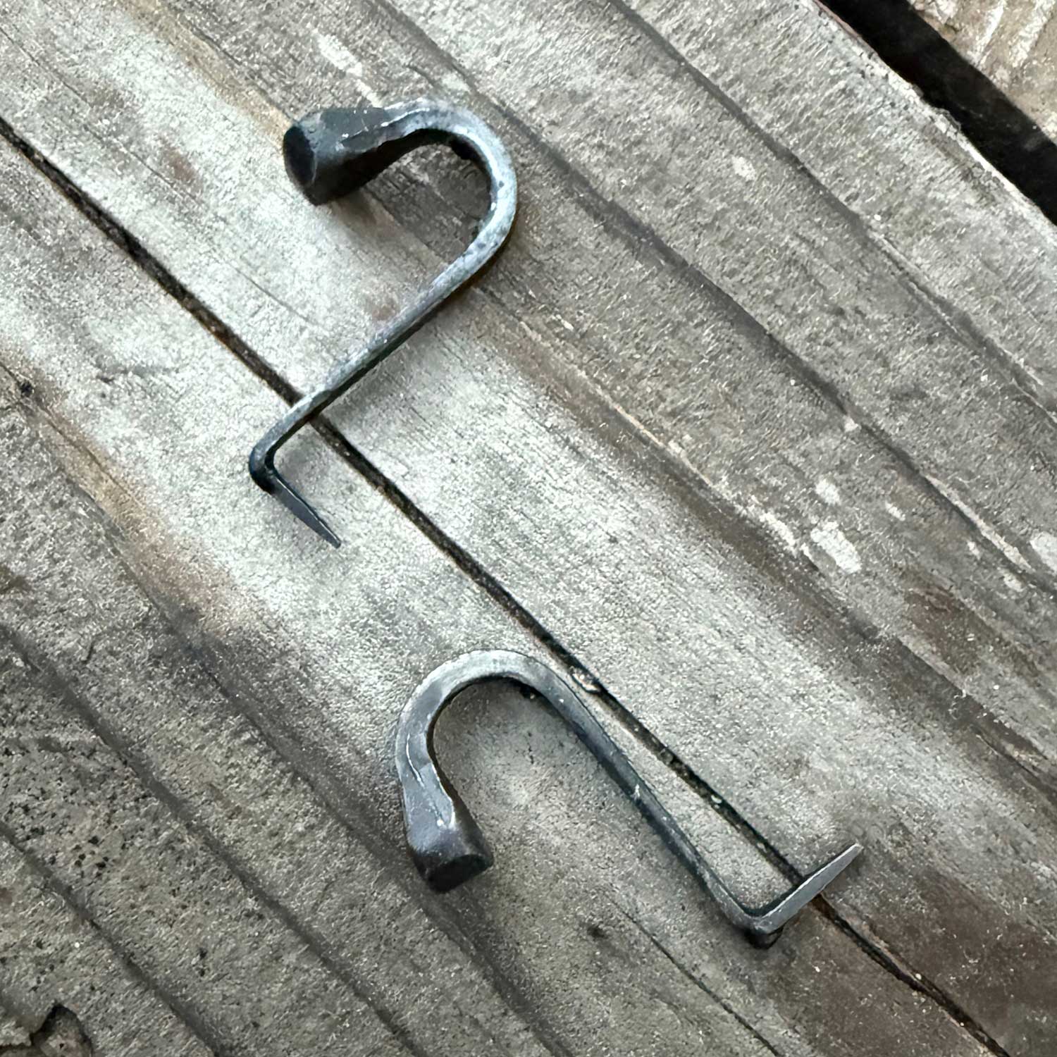 This very small hammer-in hook is designed to be installed without nails. True to its name, this hook is made from hand-wrought iron and is hammered directly into the wall or board where you need it. It measures 1.75 inches in height and 0.75 inches in depth. Crafted from solid, hand-forged iron, it is proudly made in the USA.